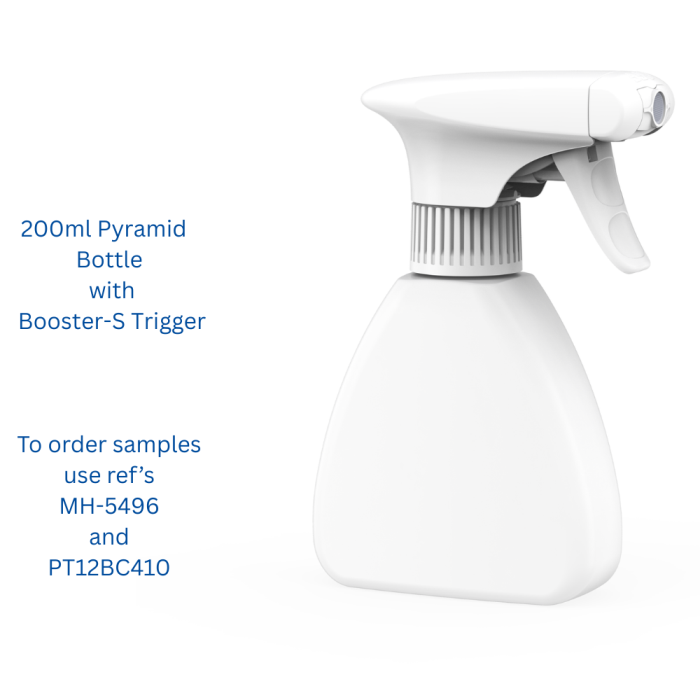 PT12BC410The Booster-S is a pre-compression trigger which delivers excellent spray control. It is made in all PP and features a screw-neck with a non-removable option. It is developed for the Home Care market. The Trigger features a variety of spray and lever options. Available in standard white and small order quantities, as well as customisable colours, Booster-S is the ideal trigger sprayer for a variety of Home Care applications.